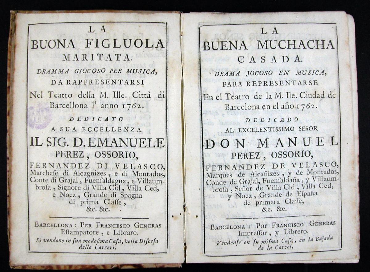 Goldoni, Carlo, 1707-1793. La Buena muchacha casada : drama jocoso en musica para representarse en el teatro de la ciudad ... de Barcelona en el año 1762 ... = La Buona figluola maritata / [musica de Niccoló Piccini]. Barcelona : por Francisco Generas ..., [1762?].