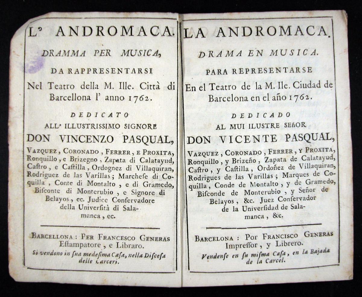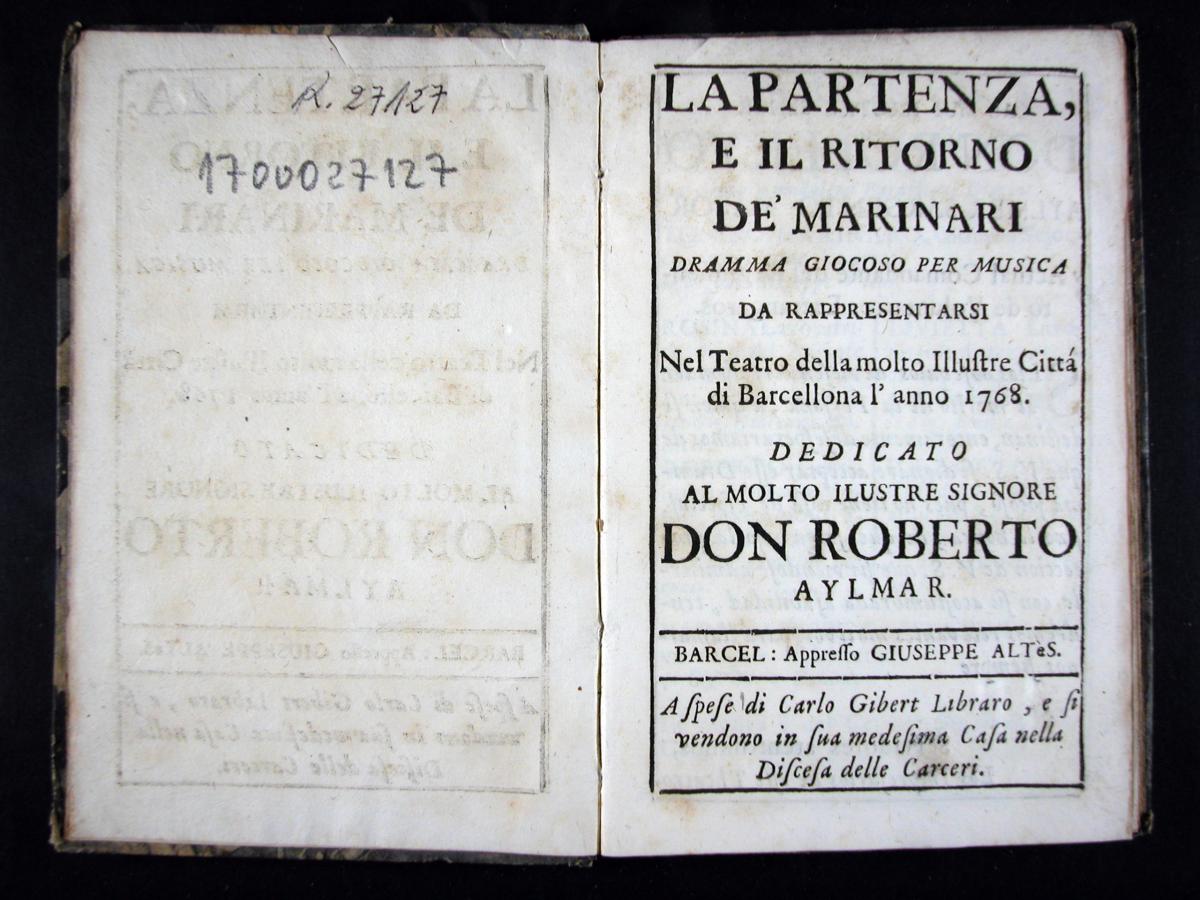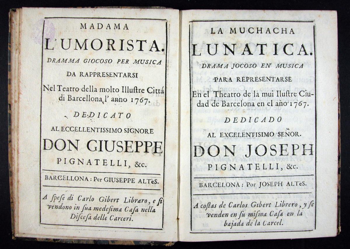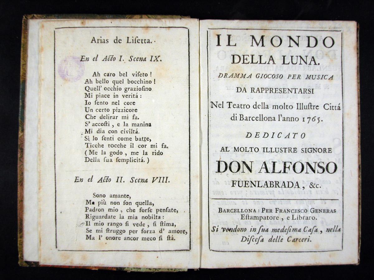 Goldoni, Carlo, 1707-1793. Il Mondo della luna : dramma giocoso per musica da rappresentarsi nel teatro della ... cittá di Barcellona l'anno 1765... Barcellona : per Francesco Generas ..., [1765?]. 07 XVIII-3343Metastasio, Pietro, 1698-1782. Alexandro en las Indias : dramma en musica de Pedro Metastasio para representarse en el teatro de la ... ciudad de Barcelona en el año de 1750 ... = Alessandro nell'Indie / dramma per musica di Pietro Metastasio ... ; [musica di Giuseppe Scolari]. Barcelona : por Pablo Campins ..., [1750?]. 07 XVIII-3226El Filosofo quimico, poeta : drama gracioso en musica para representarse en el theatro de la ... ciudad de Barcelona el año de 1750 ... = Il Filosofo chimico, poeta : drama giocoso per musica / [musica de Giuseppe Scolari]. [Barcelona : s.n., 1750?]. 07 XVIII-3228Metastasio, Pietro, 1698-1782. El Temistocles : dramma del señor abate Pedro Metastasio para representarse en el teatro de la ... ciudad de Barcelona en el año de 1756 ... = Il Temistocle / dramma del signor abate Pietro Metastasio... Barcelona : por Pablo Campins ..., [1756?] 07 XVIII-3224Galuppi, Antonio. El Amante de todas : drama jocoso en musica para representarse en el teatro de la ... ciudad de Barcelona en el año 1762 = L'Amante di tutte : dramma giocoso per musica / [libreto de Antonio Galuppi ; musica de Baldasare Galuppi]. Barcelona : por Francisco Generas, [1762?]. 07 XVIII-3200La Muchacha lunatica : drama jocoso en musica para representarse en el theatro de la ... ciudad de Barcelona en el año 1767 ... = Madama l'humorista / [musica di diversi autori]. Barcelona : por Joseph Altès : a costas de Carlos Gibert ..., [1767?]. 07 XVIII-3322La Partenza e il ritorno de'marinari : dramma giocoso per musica da rappresentarsi nel teatro della ... città di Barcellona l'anno 1768 ... / [musica di Baldasare Galuppi]. Barcel. : appresso Giuseppe Altés : a spese di Carlo Gibert ..., [1768?]. 07 XVIII-3213La Andromaca : drama en musica para representarse en el teatro de la ... ciudad de Barcelona en el año 1762 ... = L'Andromaca : dramma per musica / [musica de Nicolàs Jomelli]. Barcelona : por Francisco Generas ..., [1762?]. 07 XVIII-3234
