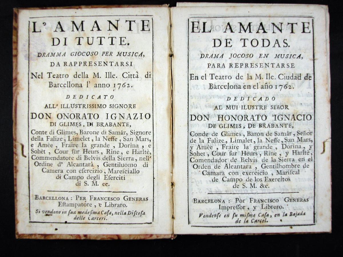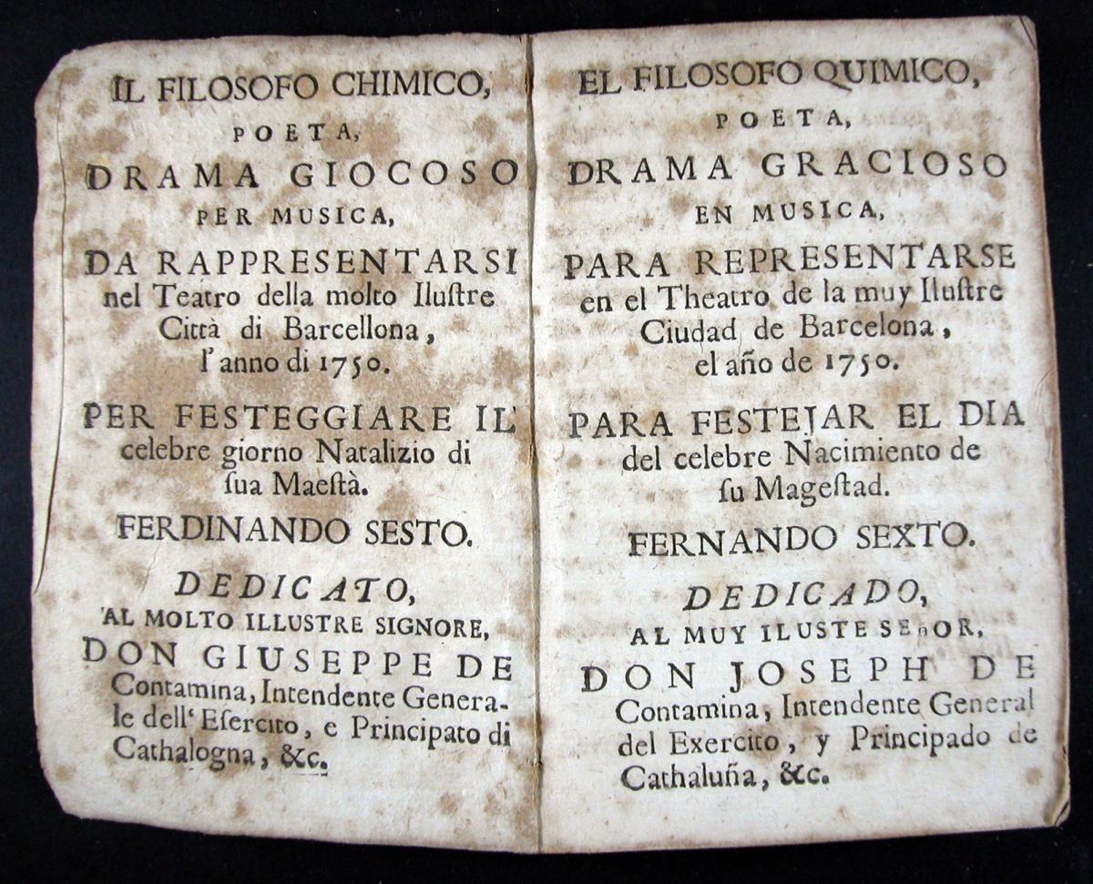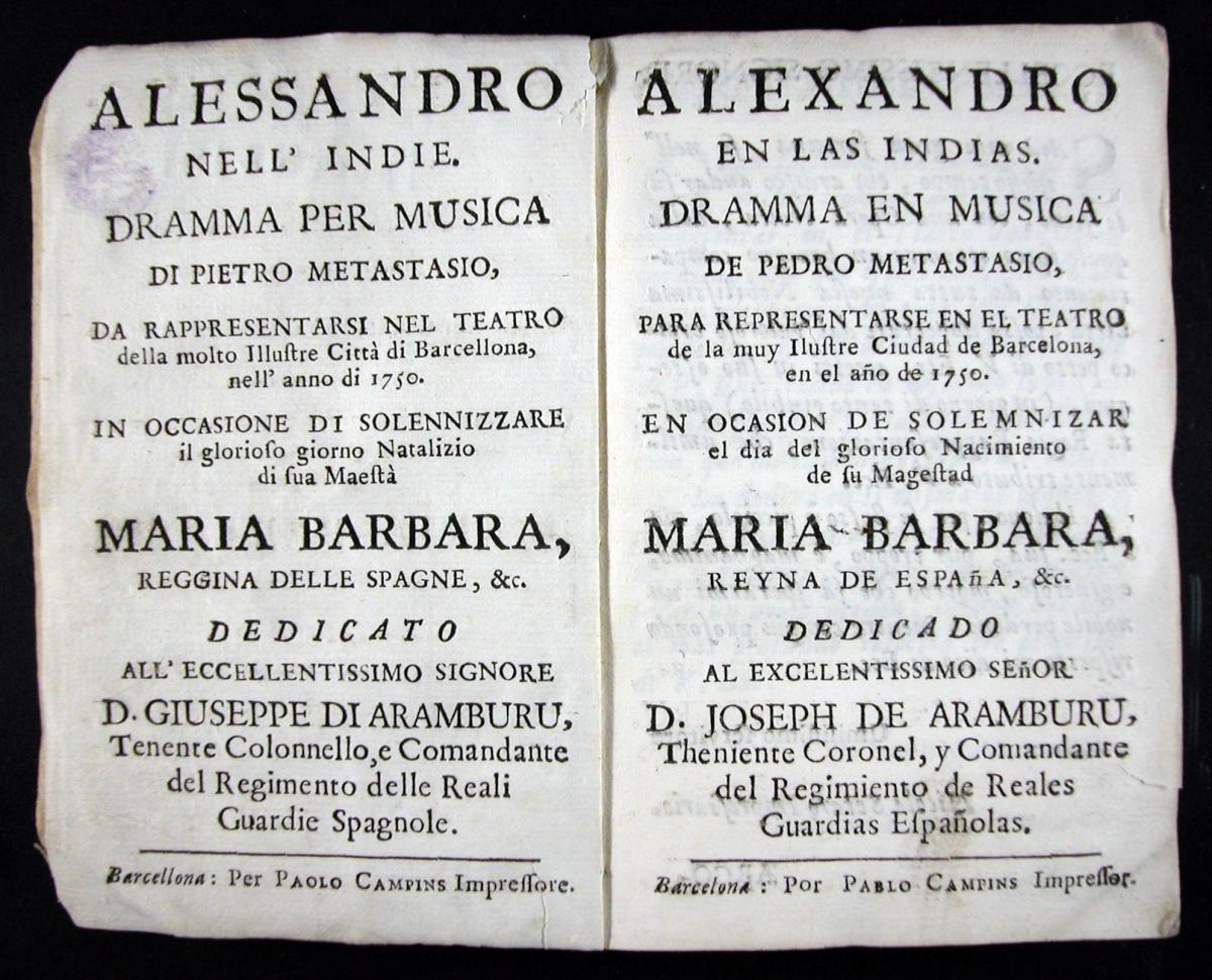 Goldoni, Carlo, 1707-1793. Il Mondo della luna : dramma giocoso per musica da rappresentarsi nel teatro della ... cittá di Barcellona l'anno 1765... Barcellona : per Francesco Generas ..., [1765?]. 07 XVIII-3343Metastasio, Pietro, 1698-1782. Alexandro en las Indias : dramma en musica de Pedro Metastasio para representarse en el teatro de la ... ciudad de Barcelona en el año de 1750 ... = Alessandro nell'Indie / dramma per musica di Pietro Metastasio ... ; [musica di Giuseppe Scolari]. Barcelona : por Pablo Campins ..., [1750?]. 07 XVIII-3226El Filosofo quimico, poeta : drama gracioso en musica para representarse en el theatro de la ... ciudad de Barcelona el año de 1750 ... = Il Filosofo chimico, poeta : drama giocoso per musica / [musica de Giuseppe Scolari]. [Barcelona : s.n., 1750?]. 07 XVIII-3228Metastasio, Pietro, 1698-1782. El Temistocles : dramma del señor abate Pedro Metastasio para representarse en el teatro de la ... ciudad de Barcelona en el año de 1756 ... = Il Temistocle / dramma del signor abate Pietro Metastasio... Barcelona : por Pablo Campins ..., [1756?] 07 XVIII-3224Galuppi, Antonio. El Amante de todas : drama jocoso en musica para representarse en el teatro de la ... ciudad de Barcelona en el año 1762 = L'Amante di tutte : dramma giocoso per musica / [libreto de Antonio Galuppi ; musica de Baldasare Galuppi]. Barcelona : por Francisco Generas, [1762?]. 07 XVIII-3200La Muchacha lunatica : drama jocoso en musica para representarse en el theatro de la ... ciudad de Barcelona en el año 1767 ... = Madama l'humorista / [musica di diversi autori]. Barcelona : por Joseph Altès : a costas de Carlos Gibert ..., [1767?]. 07 XVIII-3322La Partenza e il ritorno de'marinari : dramma giocoso per musica da rappresentarsi nel teatro della ... città di Barcellona l'anno 1768 ... / [musica di Baldasare Galuppi]. Barcel. : appresso Giuseppe Altés : a spese di Carlo Gibert ..., [1768?]. 07 XVIII-3213La Andromaca : drama en musica para representarse en el teatro de la ... ciudad de Barcelona en el año 1762 ... = L'Andromaca : dramma per musica / [musica de Nicolàs Jomelli]. Barcelona : por Francisco Generas ..., [1762?]. 07 XVIII-3234