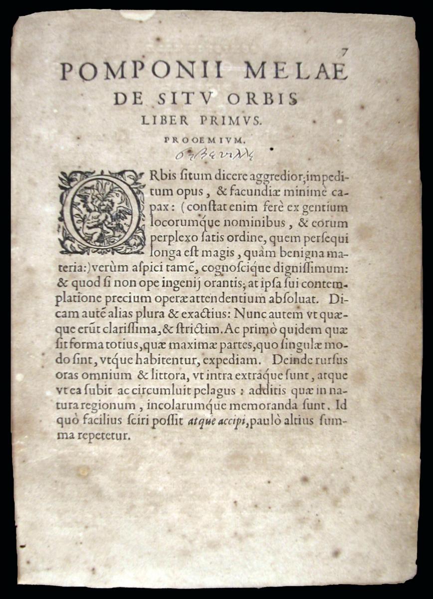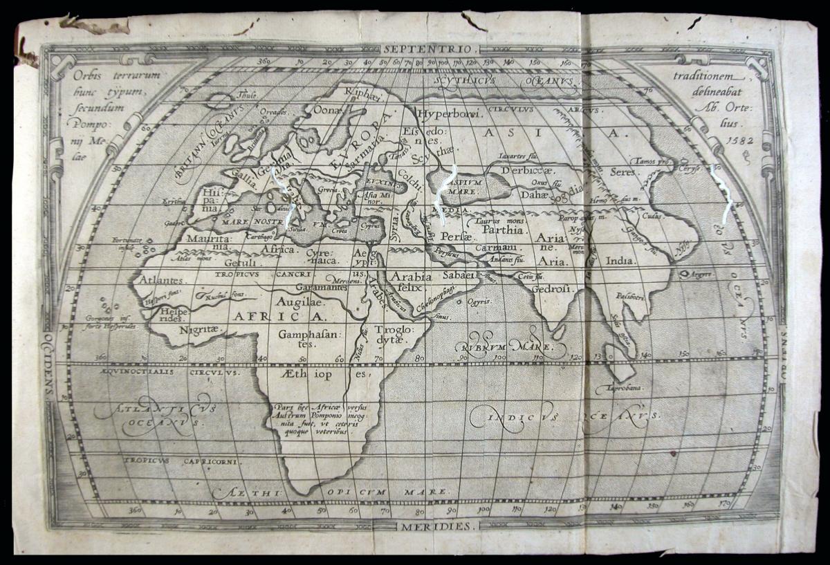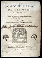 Pomponi Mela va ser un geògraf romà que va escriure la seva obra durant el governs dels emperadors Calígula i Claudi. Aquesta edició es va fer a cura d’Andreas Schottus. S’hi troba un mapamundi amb la inscripció: “Orbis Terrarum hunc typum secundum Pomponii Melae traditionem delineavit Ab. Ortelius, 1582”. Aquest mapa, que ofereix la visió del món segons Pomponi Mela, va ser executat per Abraham Ortelius a petició del mateix Andreas Schottus.