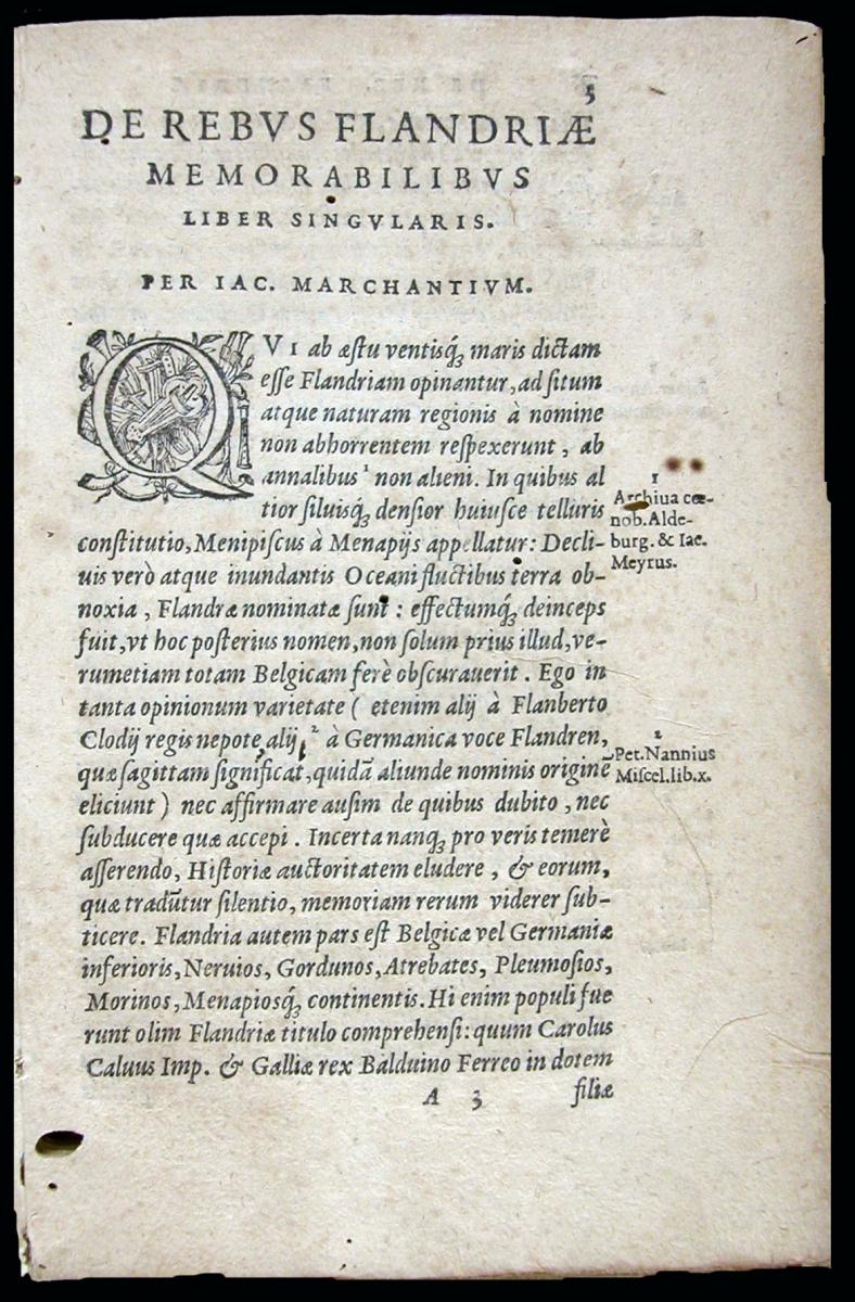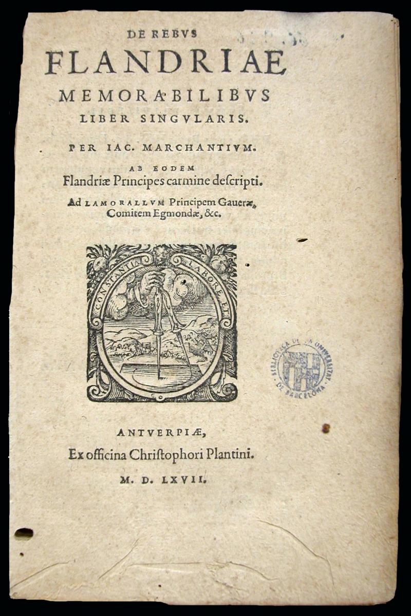 Jacques Marchant fou un historiògraf flamenc. S’uní als rebels en la lluita contra Felip II, assumint destacades posicions en l’administració. Un cop perduda la guerra, es retirà primerament a Alveringem i després a Brussel·les. L’obra conté la història de Flandes, amb la descripció dels seus territoris i de les seves institucions i una relació dels diferents conflictes bèlics succeïts, seguida d’una llista dels comtes que la governaren en forma de taula. S’imprimiren 800 exemplars. El mateix text va ser imprès per Sigmund Feyerabend el 1580 a Frankfurt. Una edició ampliada sortí de les premses de Plantin el 1596.