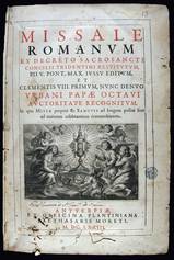 Missale Romanum : ex decreto sacrosancti Concilii Tridentini restitutum, Pii V. Pont. Max. ivssu editum et Clementis VIII. primum, nunc denuo Vrbani Papae Octavi auctoritate recognitum. Antuerpiae : ex Officina Plantiniana, Balthasaris Moreti, 1673.