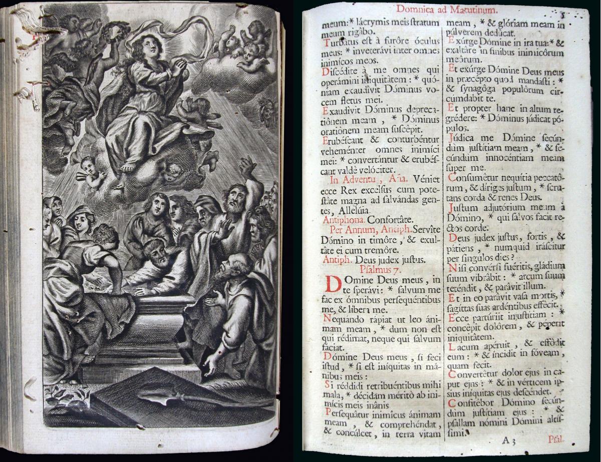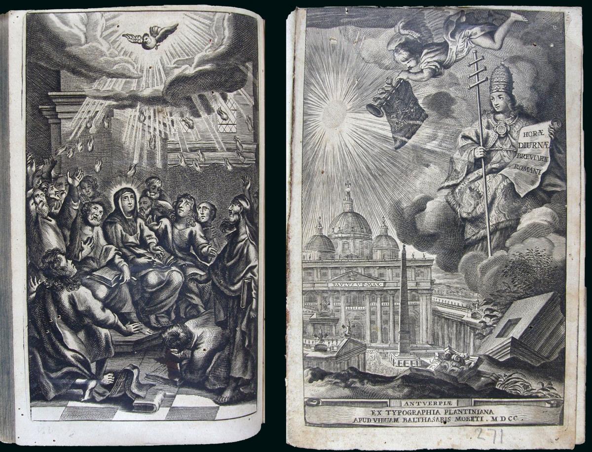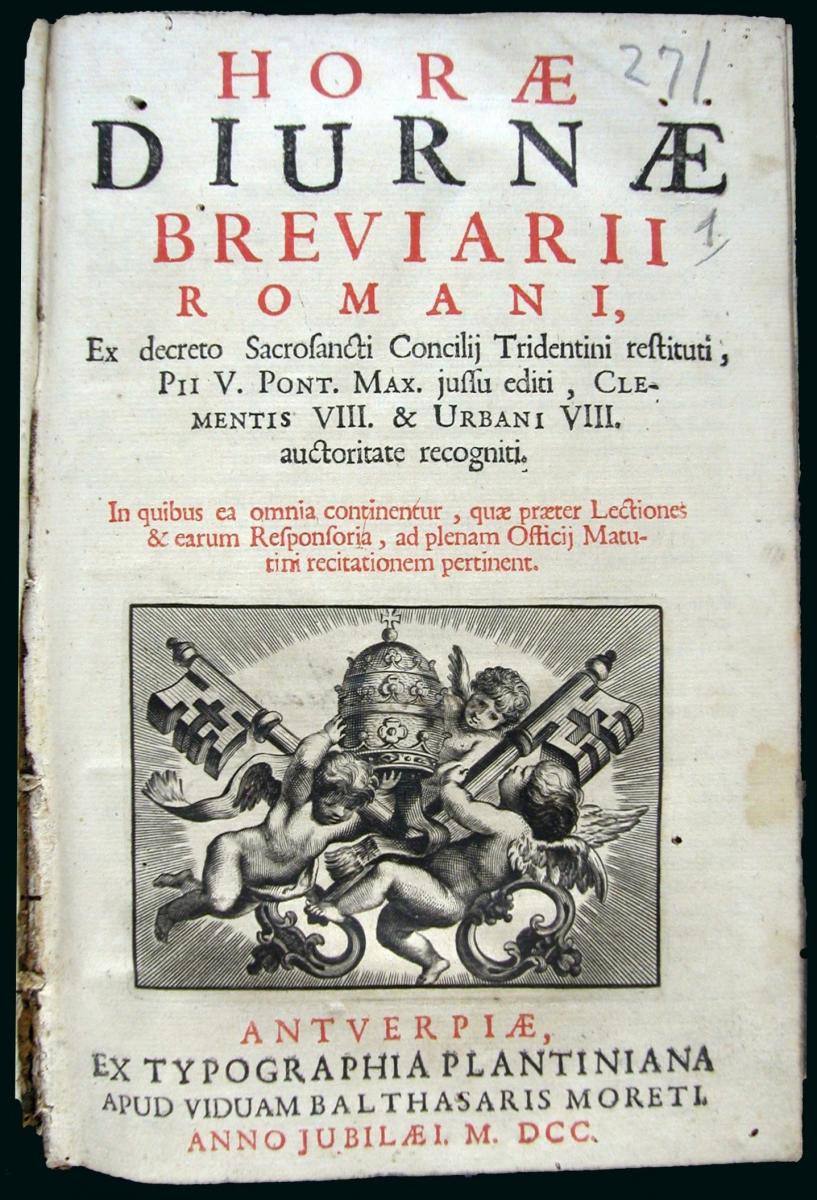 Horae diurnae Breviarii romani : ex decreto sacrosancti Concilij Tridentini restituti, Pii V Pont. Max. jussu editi, Clementis VIII & Urbani VIII auctoritate recogniti, in quibus ea omnia continentur, quae praeter lectiones & earum responsoria, ad plenam officij matutini recitationem pertinent. Antuerpiae : ex typographia Plantiniana, apud viduam Balthasaris Moreti, 1700.