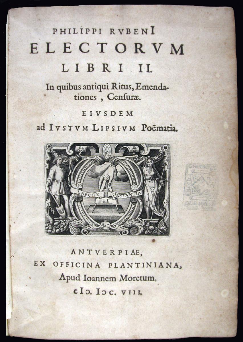 Rubens, Philippe. Philippi RubenI Electorum libri II, in quibus antiqui ritus, emendationes, censurae ; Eiusdem Ad Iustum Lipsium Poëmatia. Antuerpiae : ex Officina Plantiniana, apud Ioannem Moretum, 1608.