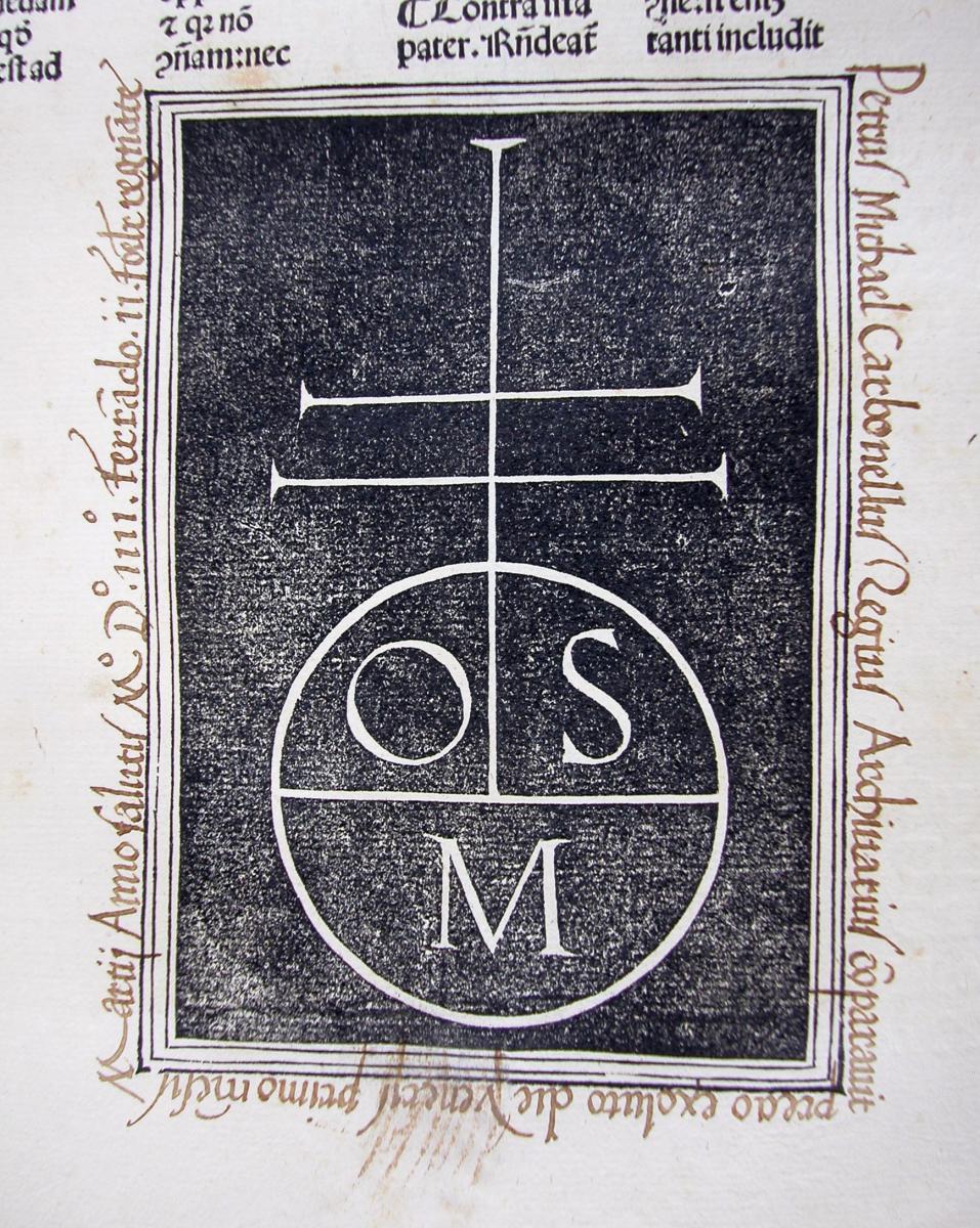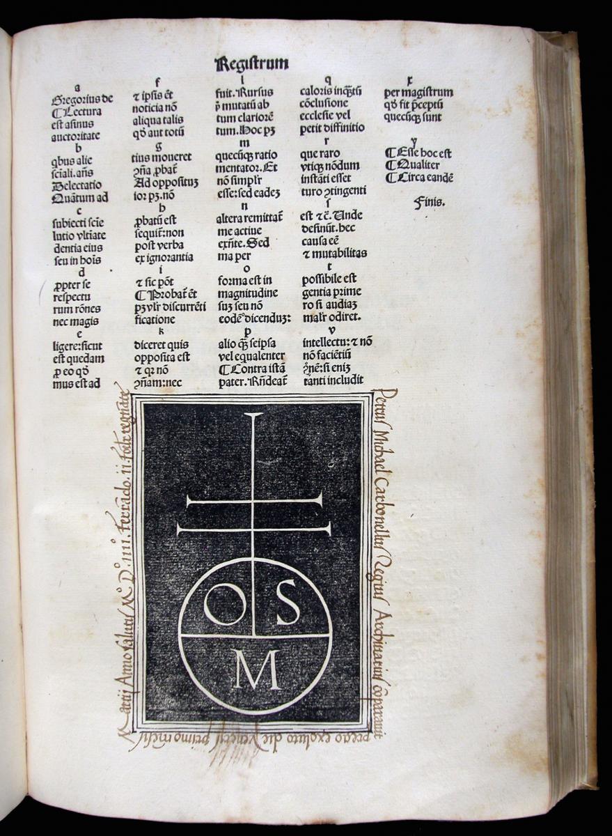 Nota de compra de Pere Miquel Carbonell al voltant de la marca tipogràfica, al f. y6 (1.III.1504): "Petrus Michael Carbonellus Regius Archiuarius comparauit pretio exoluto die veneris primo mensis Martij Anno Salutis Mº Dº iiii Ferrando ii foeliciter regnante".