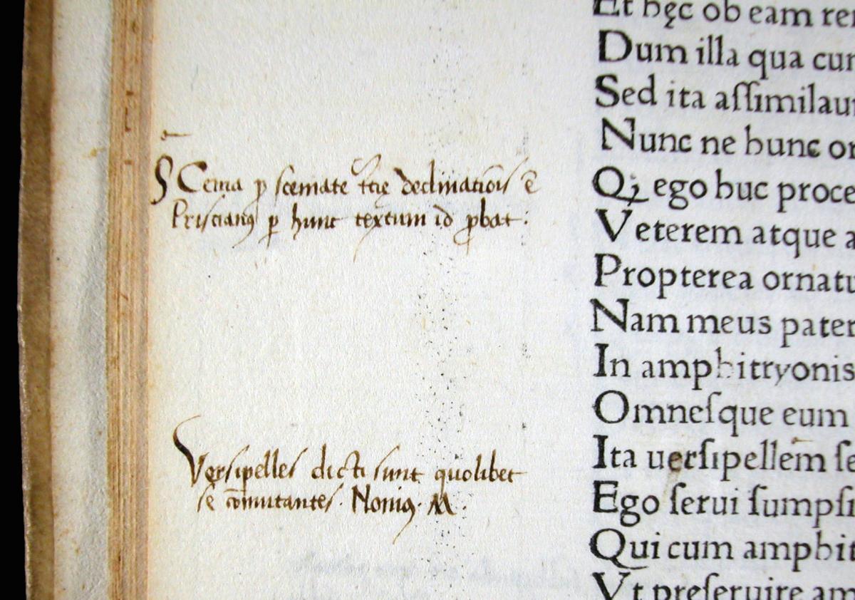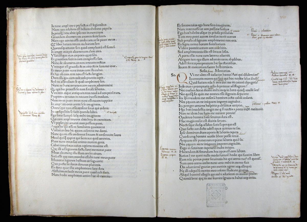 De la mà de Pere Miquel Carbonell: citacions d'Eusebi, Ciceró i Quintilià sobre Plaute al f. de guarda anterior, inicials simples en vermell, calderons, manícules, fistons, claus, trèvols, signes de crida, postil·les, títols corrents i foliació.