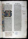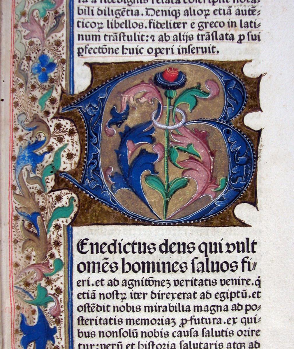Exemplar incomplet: falten el f. [Q]1 i el f. [E]6, en blanc. Enquadernació en pergamí sobre cartró (s. XX), 40 cm., guillotinat, errors al relligat dels f. [i]1 i [i]8. Alguns forats d'insectes, taques d'humitat. Orla i caplletra contornejada, ambdues amb motius vegetals i or, al f. [a]2. Ex-libris manuscrit al f. [a]2: "Ex libris Bibliotecae Carmelitanae Barchinone" i "és del Carme de Barcelona" (s. XVII).