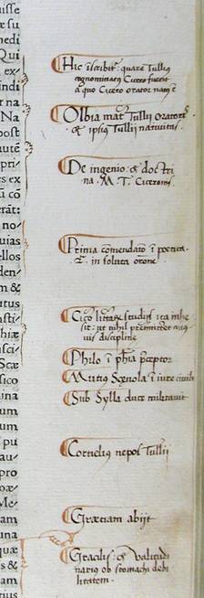 De la mà de Pere Miquel Carbonell: inicials simples, al f. a1 en blau, i a la resta en vermell, sumari al f. de guarda posterior amb nota sobre la doble foliació, calderons, fistons i manícules, títols corrents, doble foliació.