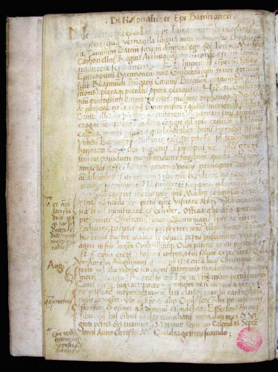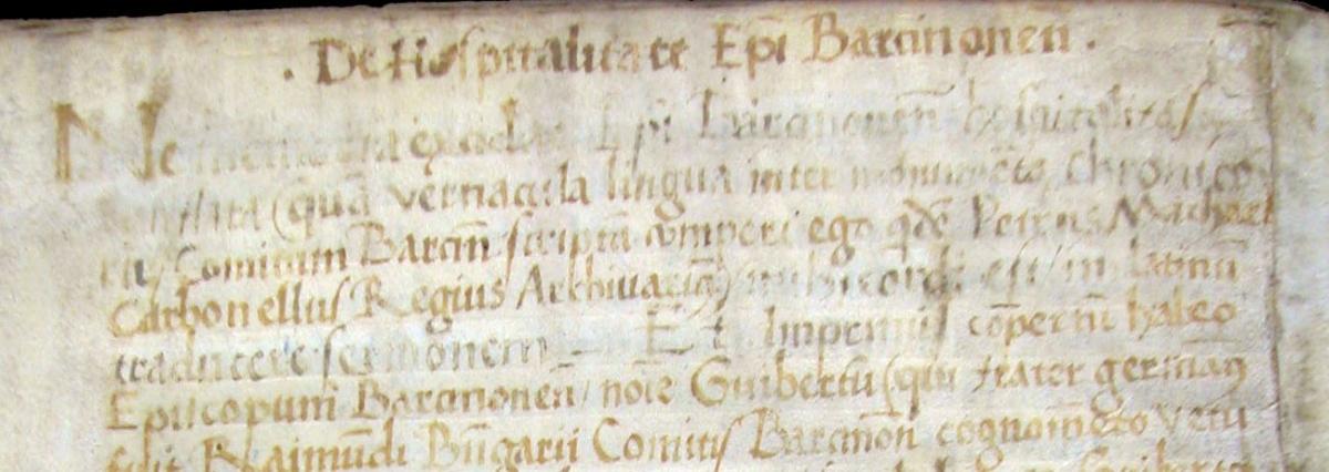 De la mà de Pere Miquel Carbonell nota al f. 6 verso "De hospitalitate episcopi barcinonensis". Inc.: "Ne memoria excid[itur] episcopi barcinonensis hospitalitas, [trans]lata, quam vernacula lingua inter monumentis chronicorum comitum barcinonensium scriptam comperi ego quidem, Petrus Michael Carbonellus, regius archivarius, mihi cordi est in latinum traducere sermonem. Et imprimis compertum habeo episcopum barcinonensem nomine Guibertum, qui frater germanus fuit Raimundi Berengarii, comitis barcinonensis, cognomento Vetustioris, pleraque pietatis opera exercuisse". Expl.: "[al marge episcopus tandem memoratus non peste sed alio morbo] moritur septimo calendas septembres anno Christi Mº quadragesimo secundo".