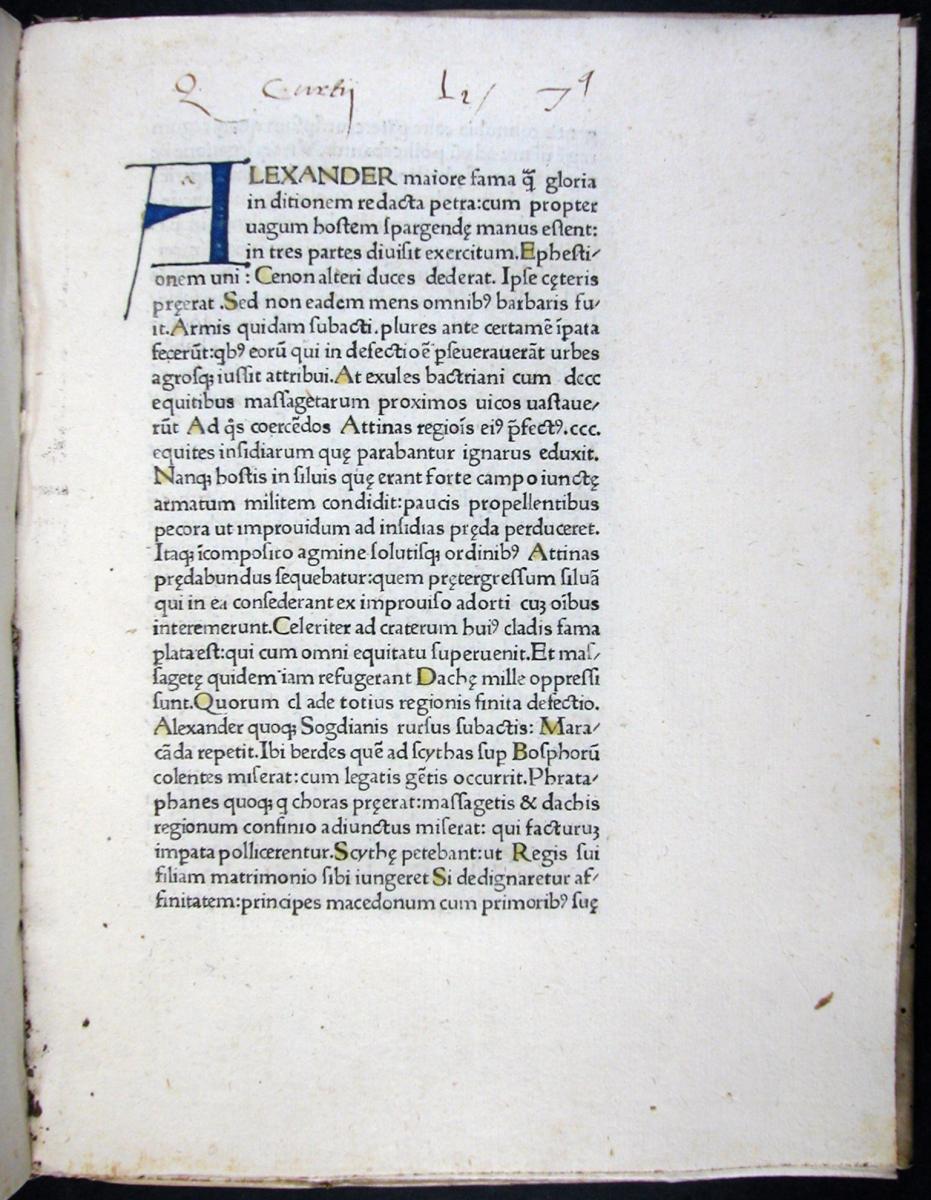 Curci Ruf, Quint. Historiae Alexandri Magni, Venècia: Wendelí d’Espira, ca. 1471. Inc 520, Procedeix de la Biblioteca Mariana del convent de Sant Francesc d’Assís de Barcelona