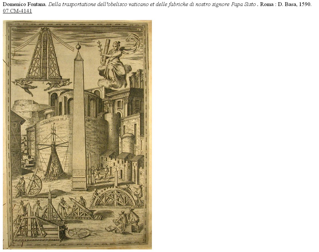 Unes altres obres d'aquesta secció, d'un estil molt diferent, són un dels volums, el tercer, de l'obra Le pitture antiche di Ercolano e contorni incise con qualche spiegazione, imprès a Nàpols el 1762. L'altra és la molt curiosa i valuosa obra de Domenico Fontana Della trasportatione dell'obelisco Vaticano, imprès a Roma el 1590. Parla amb tot detall de text i de gravat de l'aixecament, el transport i la col·locació de l'obelisc al centre de la nova plaça de Sant Pere del Vaticà i de les obres fetes a Roma durant el pontificat de Sixt Vè.