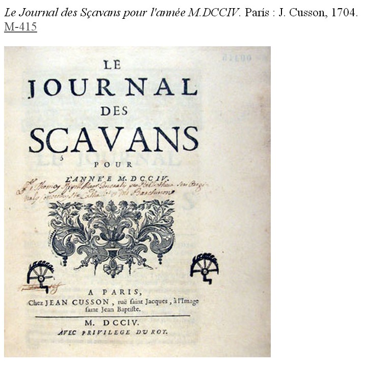 19. Le journal des Sçavans pour l'année M.DCCIV. París : J. Cusson, 1704.