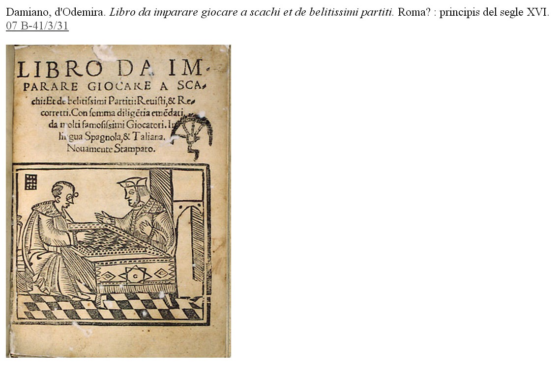 És interessant i rar el petit llibret de Damiano d'Odemira Libro da imparare a giocare a scachi et de bellitissimi partiti, imprès a Roma a principis del segle XVI.