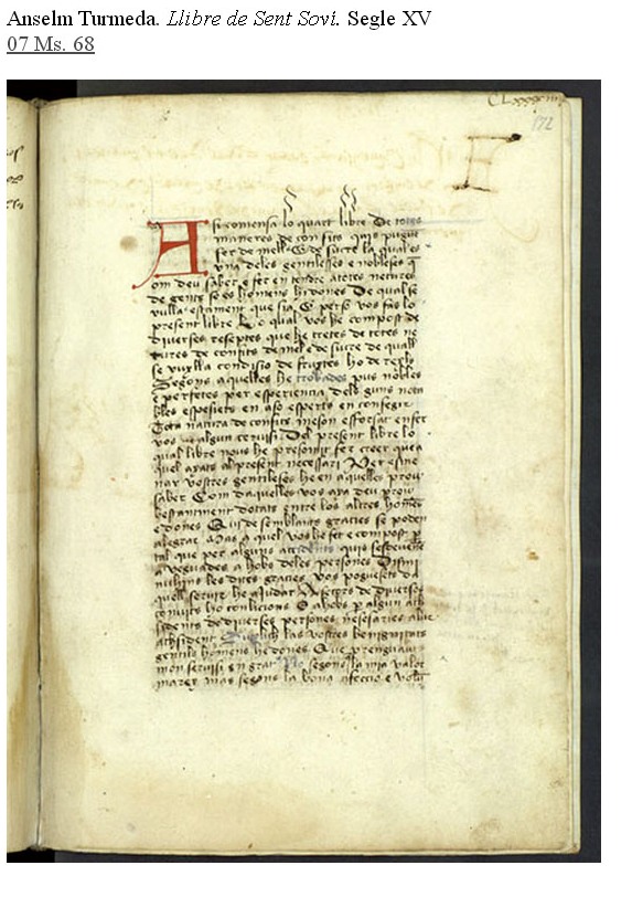 Un altre manuscrit important de la nostra biblioteca és el Llibre de Sent Soví, cèlebre llibre de receptes de cuina, que figura amb personalitat pròpia al costat dels més antics receptaris medievals europeus de cuina. És la darrera part d'un volum miscel·lani que conté també, a més d'altres tractats, un tractat de falconeria (Tractat dels aucells de caça), un de receptes de perfums (Flors de receptes del tresor de beutat), i un altre de receptes de pastisseria (De totes maneres de confits). D'aquest important manuscrit que conté 220 receptes de cuina, se'n conserva una altra versió més reduïda a la Biblioteca de la Universitat de València que prové del convent dels dominicans d'aquella ciutat.