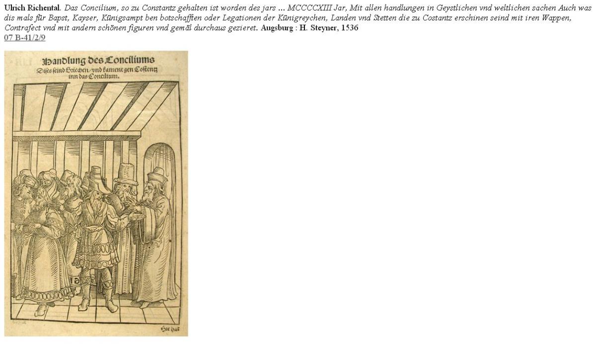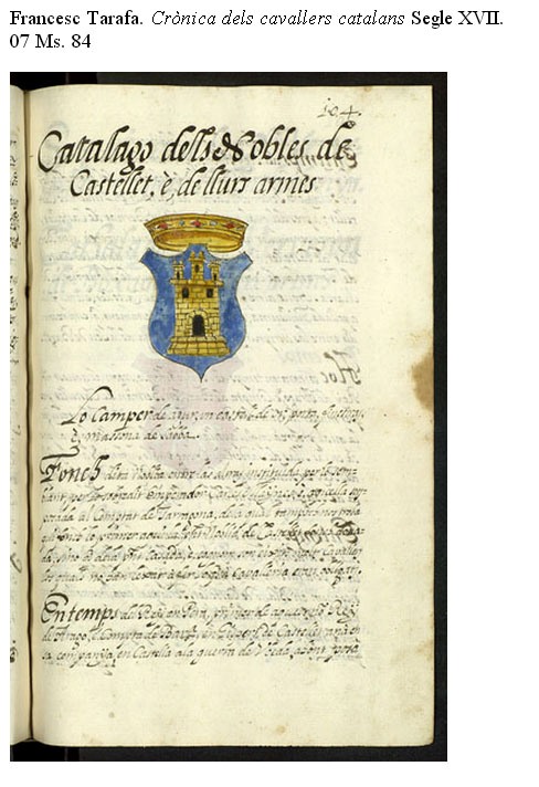 A la mateixa secció hi trobem dues obres interessants per l'heràldica. Una és una història del concili de Constança, impresa a Augsburg el 1536, profusament il·lustrada amb xilografies que representen personatges i fets del concili i els escuts nobiliaris de tots els participants. També formava part de la biblioteca del convent de Sant Josep. L'altra, és obra de l'arxiver de la catedral de Barcelona i historiador Francesc Tarafa. És una anomenada Crònica dels cavallers catalans amb la reproducció acolorida dels seus escuts d'armes. Prové de la biblioteca dels dominicans de Barcelona.