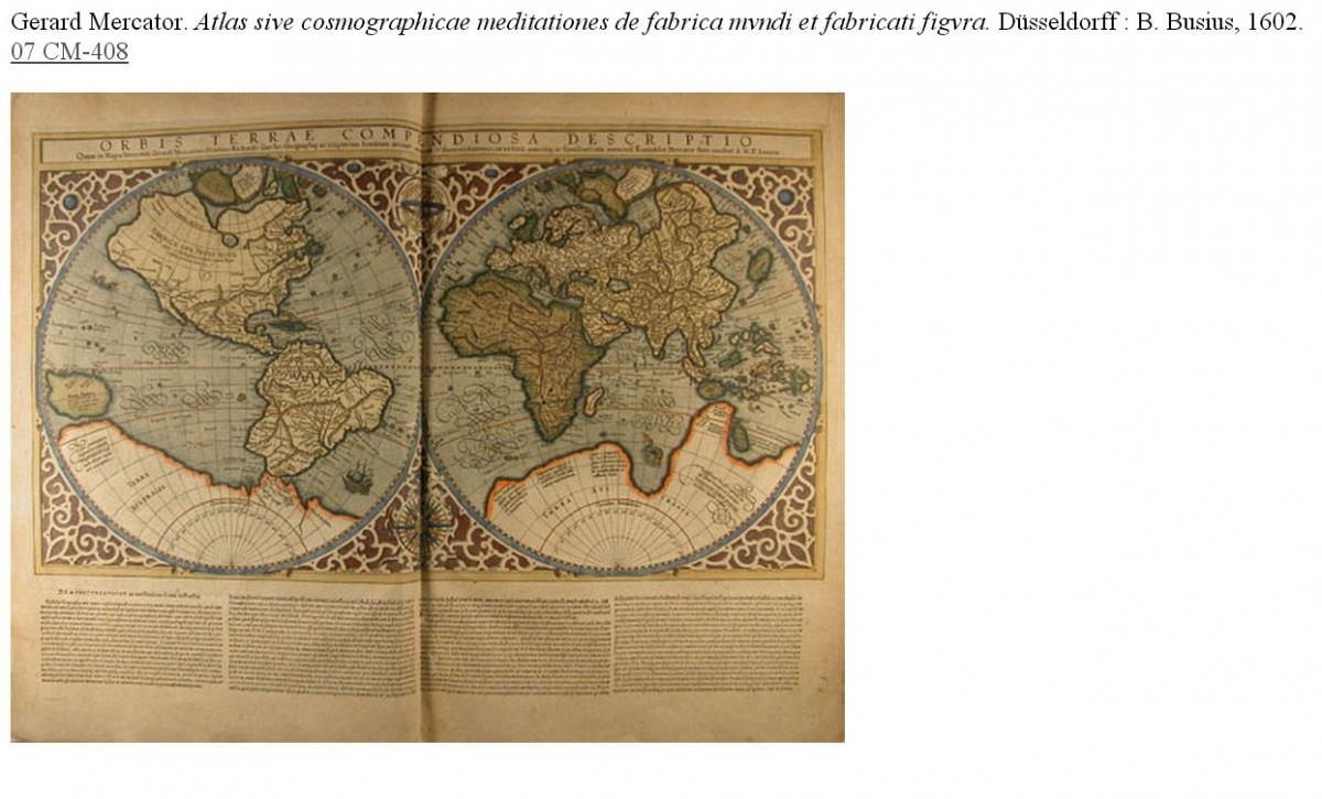 Les mostres de l'apartat de geografia són tres obres de capital importància: El bellíssim exemplar de l'Astronomicum Caesareum, de Peter Bennewitz, conegut per la llatinització del seu nom com a Petrus Apianus/Pere Apià, matemàtic, geògraf i astrònom. Aquesta obra ha estat considerada com a l'imprès més espectacular del segle XVI. És una de les obres cimeres de la impremta per la bellesa i la riquesa de l'ornamentació, per les esferes movibles, pels instruments científics que hi ha representats i pel colorit dels gravats, tot fet al mateix taller d'impressió propi de l'autor. Aquesta obra fa honor tant a la investigació com a la tipografia. El resultat és un exemplar perfecte. Tot el volum combina text i imatge amb jocs de formes i de colors. Apià alhora que hi presenta els instruments que ell mateix havia fet per a les seves investigacions hi explica la manera de construir-los. Gran part de l'obra està consagrada a l'astrologia, a la qual es dedicaven normalment els astrònoms del segle XVI. L'edició va ser costejada per l'emperador Carles V, de qui Pere Apià era l'astrònom i l'astròleg oficial. Prové del convent de santa Caterina dels frares dominicans de Barcelona, i probablement de la biblioteca de fr. Tomàs Ripoll, que fou superior general de l'orde durant llarg temps. Als 92 anys morí a Roma, on havia format una gran biblioteca d'uns 22.000 volums, aplegant nombroses edicions sortides dels grans centres europeus d'impressió durant els segles XVII i XVIII, i que en morir llegà al seu convent de Santa Caterina de Barcelona. No cal insistir en la importància dels geògrafs Mercator i Blaeu. Del primer en presentem un exemplar extraordinari del seu Atlas bellament il·luminat. En aquesta edició de Mercator es publicà per primera vegada el mapa del Pol Nord representat en forma de quatre illes d'acord amb la relació del monjo anglès del segle XIV Nicolau de Lynn. Prové del convent de Santa Caterina i del fons de fr. Tomàs Ripoll. També està il·luminat i prové de Santa Caterina, el volum I de l'edició castellana de l'Atlas Maior de Blaeu. Aquesta edició mai no va ser completada, en part a conseqüència de l'incendi que arrasà la gran impremta de Blaeu la nit del 22 al 23 de febrer de 1672, que malmeté la majoria de les planxes.
