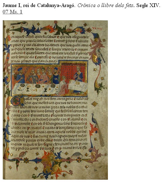Comença la segona secció de l'exposició amb la Crònica del Rei Jaume I de Catalunya-Aragó, que brilla amb llum pròpia, tant pel contingut del manuscrit i el seu significat, com per la història del volum en concret. És la crònica autobiogràfica del rei. S'hi diferencien clarament dues parts. La primera, d'un llenguatge molt viu, narrat en primera persona, dictada probablement pel mateix rei als amanuenses de palau. A la segona part la narració és en tercera persona i és possiblement una reelaboració de la història a partir de les cròniques existents a l'arxiu reial. L'exemplar original és perdut i aquest n'és la còpia que en podríem dir oficial. Està datada al monestir de Poblet el 17 de setembre de 1343, escrita per Celestí Destorrents. Hi ha 13 caplletres inicials amb la figura del rei en diverses posicions que donen origen a orles que ornamenten la pàgina, i al f. 27 hi ha una miniatura amb la representació d'un banquet durant el qual es decidí la conquesta de Mallorca. Formava part de la biblioteca del canonge Besora que llegà al convent dels carmelitans descalços de Barcelona.