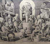 A l’exposició també podeu trobar un gravat que il·lustra com es fa la destil·lació en un laboratori d'alquímia. Distillatio. Gravat de Phillipp Galle, segons Stradamus (Jan van der Straet). Holanda, ca. 1580.