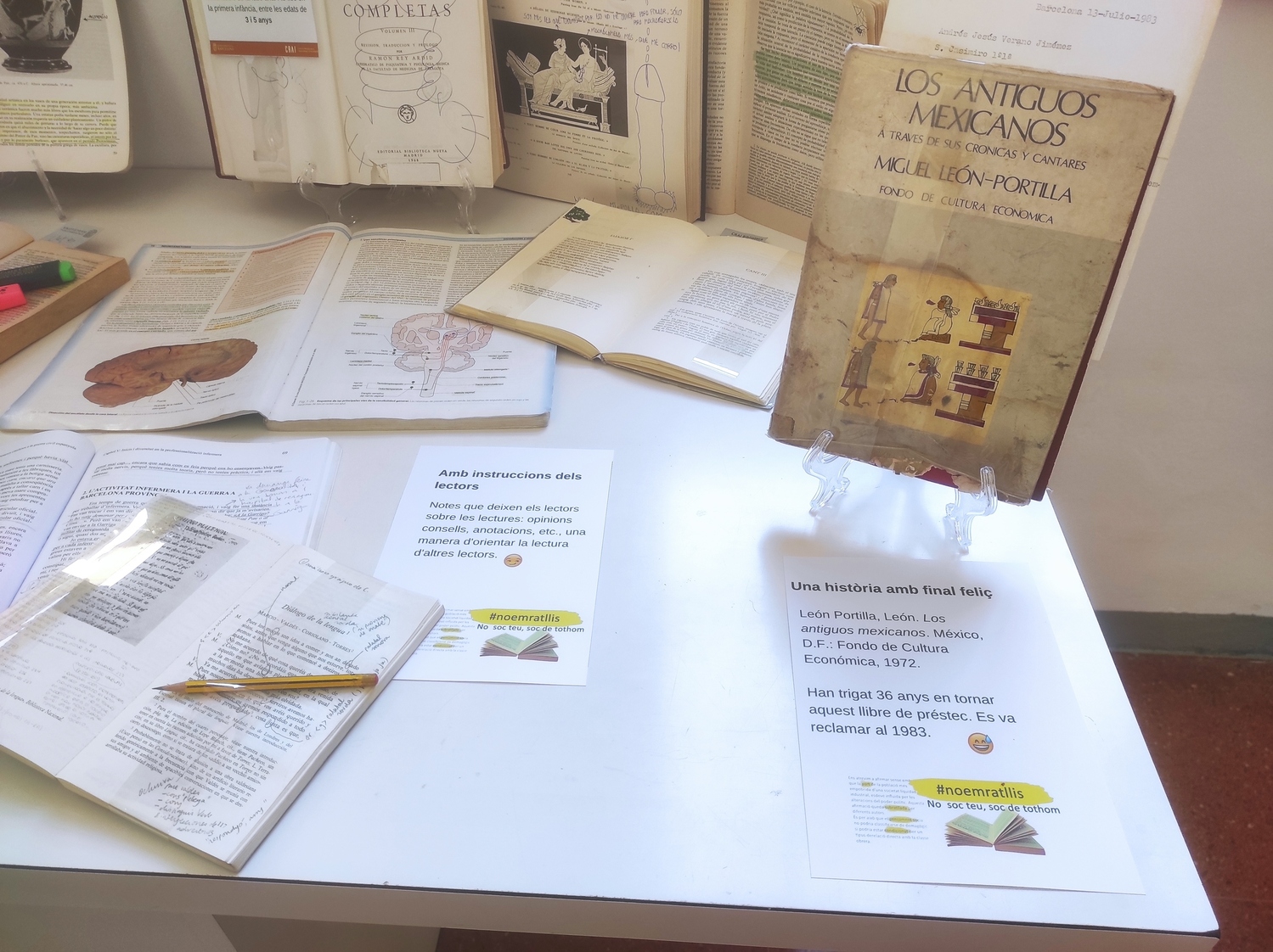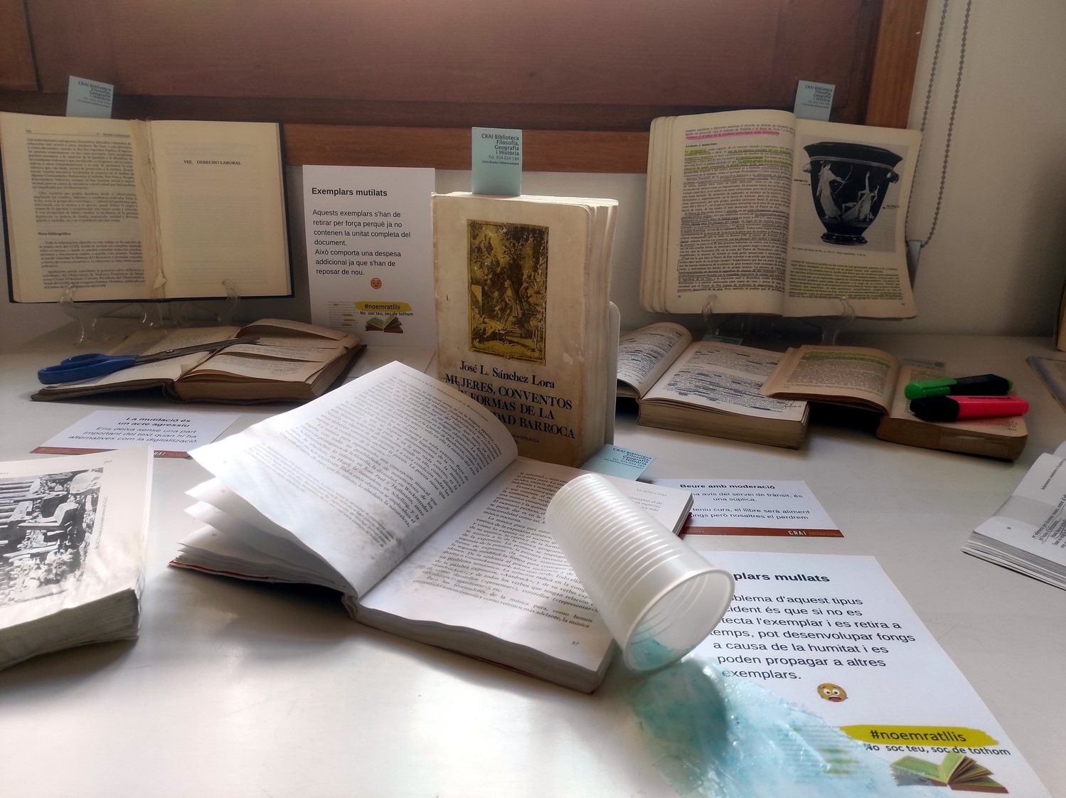 La campanya #noemratllis té com a objectiu sensibilitzar i conscienciar sobre la importància de respectar el fons bibliogràfic. Un fons que és de tots i que mantenim i fem créixer per tal de donar suport a la comunitat universitària i a la societat en general. La mostra il·lustra el mal ús que es fa dels llibres: documents ratllats, tacats, amb notes al marge, trencats, perduts, “tunejats”, amb comentaris de valoració de l’obra, amb dibuixos, etc.