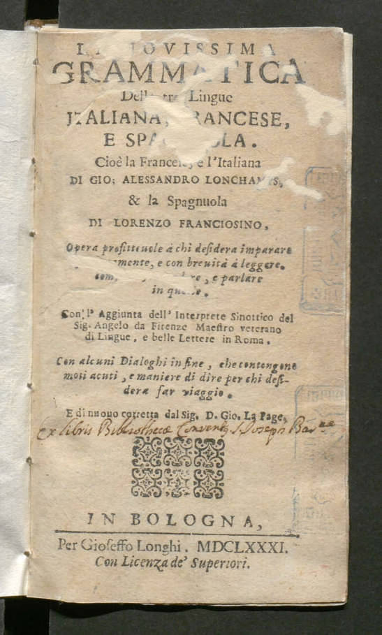 • Lonchamps, Jean Alexandre. Novissima grammatica delle tre lingue italiana, francese e spagnuola : cioè la francese e l'italiana di Gio. Alessandro Lonchamps & la spagnuola di Lorenzo Franciosino ...: con l'aggiunta dell'interprete sinottico del Sig. Angelo da Firenze ...: con alcuni dialoghi in fine, che contengono moti acuti e maniere di dire per chi desidera far viaggio / e di nuouo corretta dal Sig. D. Gio. La Page. In Venetia : per Combi & La Nou, 1669 (Disponible a BiPaDi)