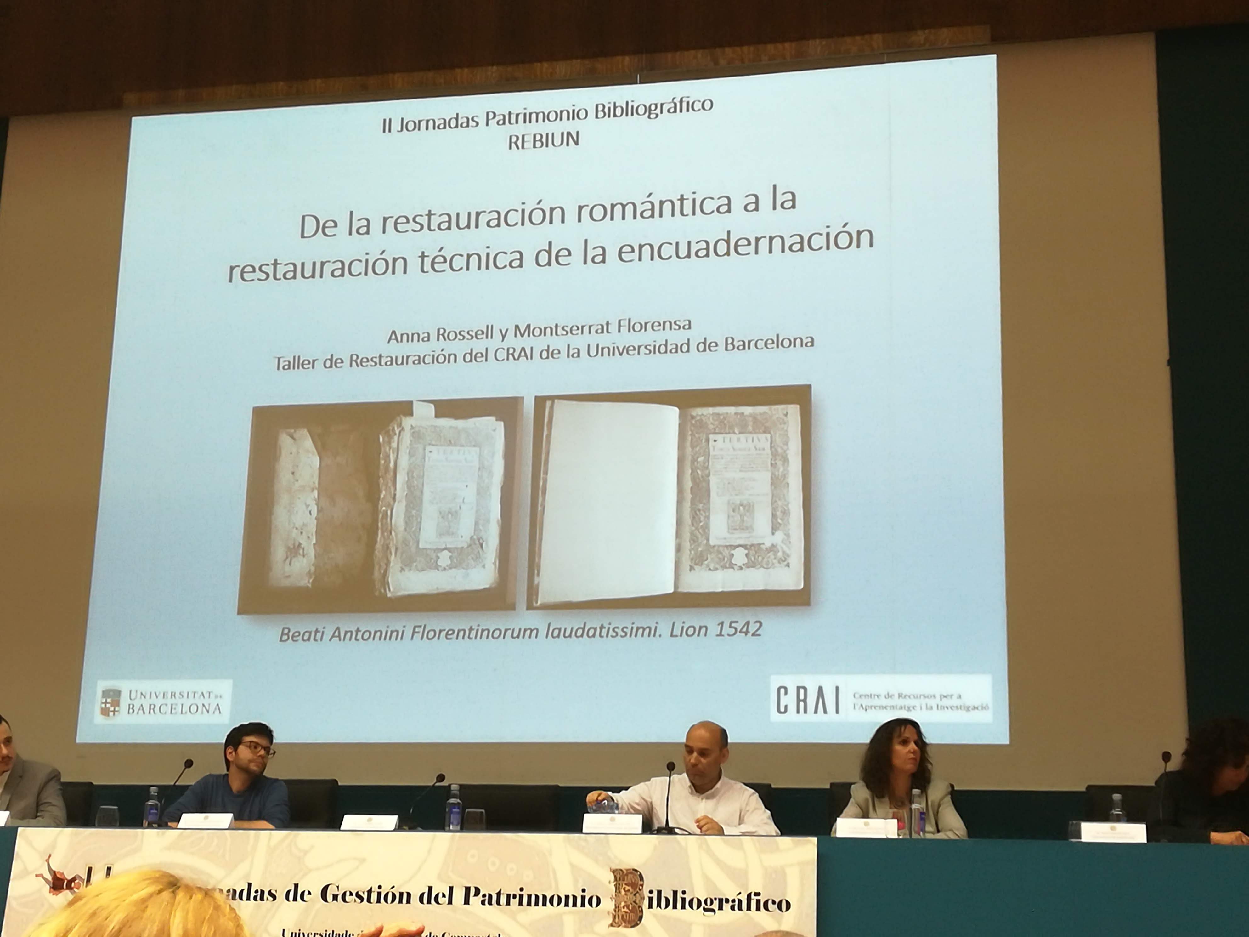 Les Jornadas s’han estructurat en dos bloc temàtics diferenciats: Gestió de la col·lecció, i Restauració i Conservació. El CRAI de la UB ha participat en tots dos blocs amb comunicacions defensades per Gemma Caballer del CRAI Biblioteca de Reserva, en el primer bloc, i per Montserrat Florensa i Anna Rossell del CRAI Taller de Restauració, en el segon.