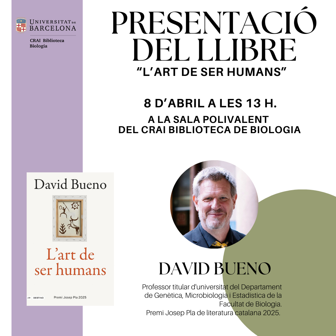 Edicions Destino ha publicat recentment el llibre L’art de ser humans del Dr. David Bueno, professor de la Facultat de Biologia. El llibre, guardonat amb el Premi Josep Pla 2025, connecta la ciència amb l’humanisme i convida a descobrir l’Homo artisticus que tothom porta dins i a utilitzar la creativitat i el pensament crític per construir una societat més rica, plena i lliure.