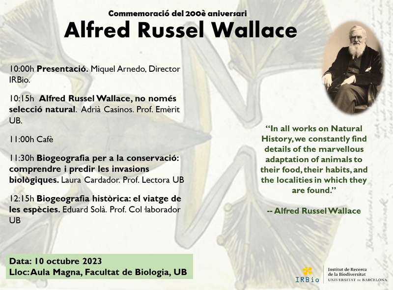 L'acte central serà el dimarts 10 d'octubre, de 10 a 13 h, a l'Aula Magna de la Facultat i comptarà amb la presència i participació de Miquel Arnedo, director de l'IRBio i dels professors Adrià Casinos, Laura Cardador i Eduard Solà.