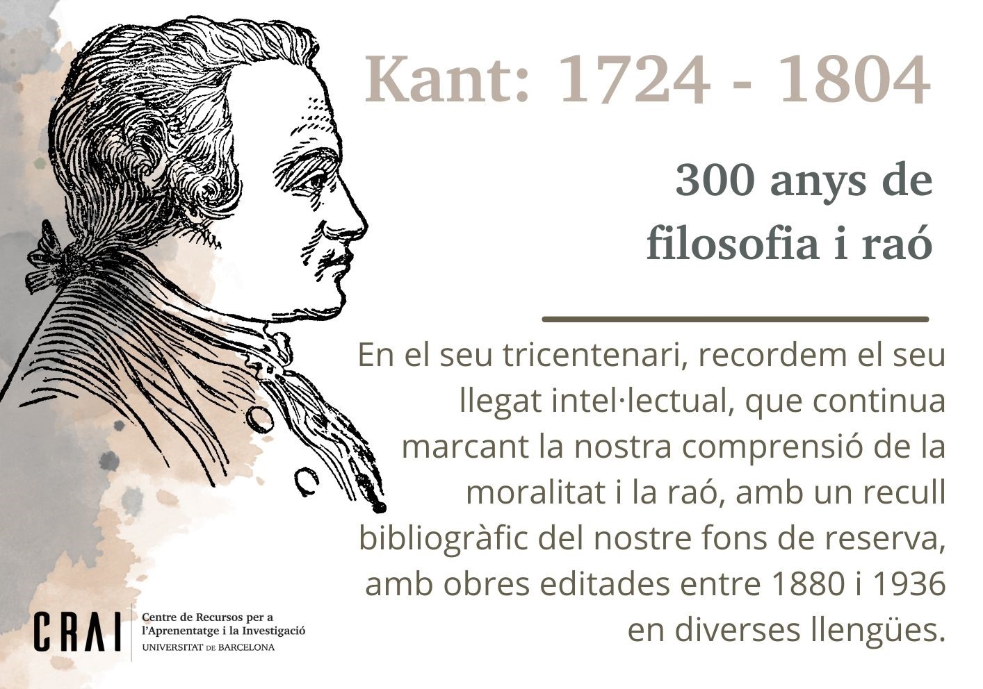 En el seu tricentenari, el CRAI Biblioteca de Filosofia, Geografia i Història recorda el seu llegat intel·lectual, que continua marcant la nostra comprensió de la moralitat i la raó, amb un recull bibliogràfic del seu fons de reserva, amb obres editades entre 1880 i 1936 en diverses llengües.