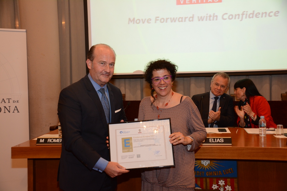 El lliurament de la distinció ha tingut lloc el passat dimecres, 9 de maig, a l’Aula Capella de l’Edifici Històric de la UB, en un acte presidit pel rector Joan Elias, i en el qual també han participat la vicerectora de Docència i Ordenació Acadèmica, Amelia Díaz; la directora del CRAI, Judit Casals; el president executiu de Bureau Veritas Espanya i Portugal, José Luis Manglano, i el director de Vida Associativa i Coneixement del CEG, Miquel Romero.