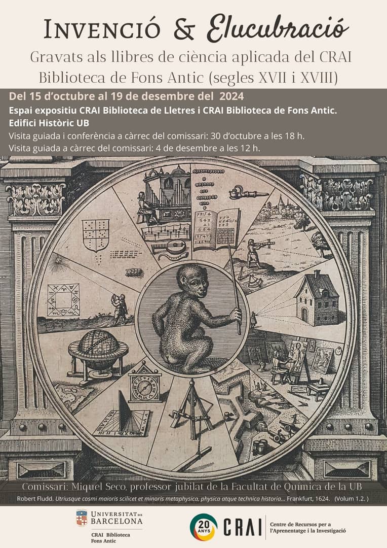 Miquel Seco, professor jubilat de la Facultat de Química de la UB, després de més d’una dècada d’estudi i identificació de llibres antics de caràcter científic, ha comissariat la mostra amb el títol: Invenció & elucubració. Gravats als llibres de ciència aplicada del CRAI Biblioteca de Fons Antic (segles XVII i XVIII), que es pot visitar a les vitrines de l’espai expositiu dels CRAI Biblioteques de Lletres i de Fons Antic fins al 19 de desembre.