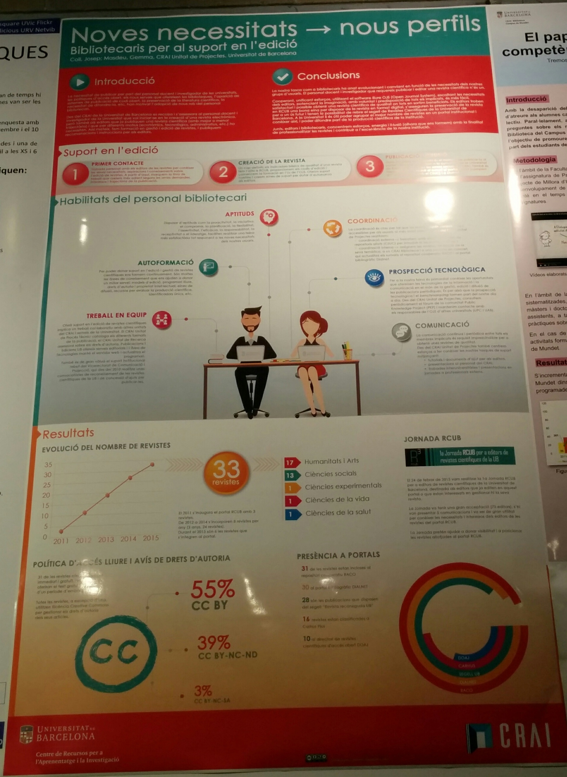 Pel que fa als pòsters presentats, un explicava El paper del CRAI Biblioteca en l’adquisició de competències informacionals: col·laboració i contagi, i va ser preparat per Jordi Tremosa, Anna Agell, Xevi López, Núria Comas, Mercè Cardona, Mar Flores, Àngels Pedrazuela, Maite Tarrida i Conxa Àlvarez del CRAI Biblioteca del Campus de Mundet. L'altra participació en forma de pòster va ser la de Gemma Masdeu i Josep Coll, del CRAI Unitat de Projectes, amb el títol Noves necessitats → nous perfils. Bibliotecaris per al suport en l’edició.