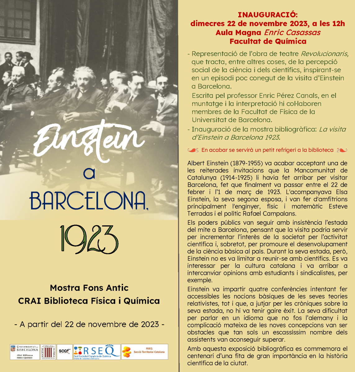 El pròxim dimecres 22 de novembre a les 12 hores, s'inaugura la divuitena Mostra del Fons Històric del CRAI Biblioteca de Física i Química amb l'exposició Einstein a Barcelona, 1923. L'acte d'inauguració tindrà lloc a l'Aula Magna Enric Casassas de les Facultats de Física i de Química de la UB.